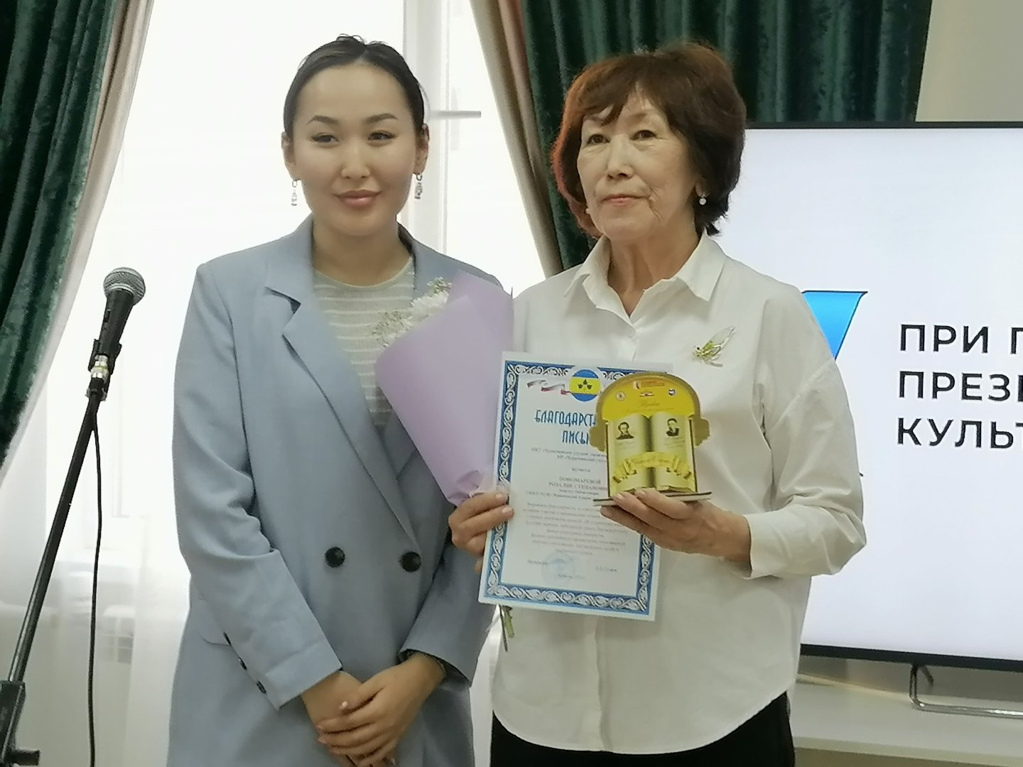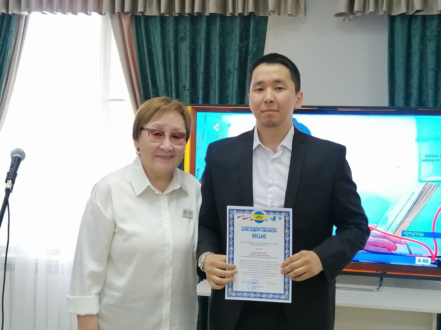 “Культура көҕүлээһинин өйүүр дойду Президенин фондатын» күрэҕин кыайыылаахтара улуустааҕы киин библиотека уонна дьахтар Сүбэтэ “Норуот инники кэскилэ – тылыгар” ( “В сохранении языка – будущее народа”) бырайыага олоххо киириитин бэлиэтиир, түмүктүүр үөрүүлээх түгэнэ буолла. Улуустааҕы киин библиотека сүрүннүүр библиотекара, ааптар Римма Петрова бырайыак туһунан сырдатта. Нуучча улуу суруйааччыта А.С.Пушкин “Евгений Онегин” айымньытын сахалыы тылынан биир дойдулаахпыт, буойун-суруйааччы Макаров Г.И. –Дьуон Дьаҥылы тылбааһын Чурапчытааҕы аграрно-техническай колледж студеннара ааҕан аудио кинигэ оҥоһуллубут. Чурапчы улууһун баһылыгын социальнай боппуруостарга солбуйааччы Мария Филипповна Кронникова төрөөбүт тылы харыстыыр, сайыннарар суолталаах кэскиллээх бырайыак буоларын бэлиэтээтэ. Бырайыак олоххо киирбитинэн эҕэрдэлээн туран Римма Викторовнаҕа уонна Мотрена Николаевна Захароваҕа улуус баһылыгын Бочуотунай грамоталарын туттарда. Бырайыакка үлэлэспит, өйөөбүт социальнай партнердарга, аудио кинигэ тахсарыгар үлэлэспит педагог-библиотекарь Розалия Степановна Пономареваҕа, “Айыллаан” сынньалаҥ киин специалиһыгар Андрей Илларионовка, колледж студеннарыгар улуустааҕы культура управлениятын уонна киин библиотека махтал суруктара үөрүүлээх быһыыга-майгыга туттарылыннылар.
