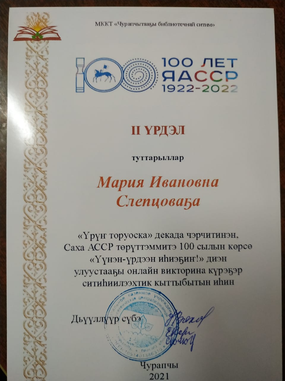 2 үрдэл — Мария Ивановна Слепцова (Чурапчы нэһилиэгэ);