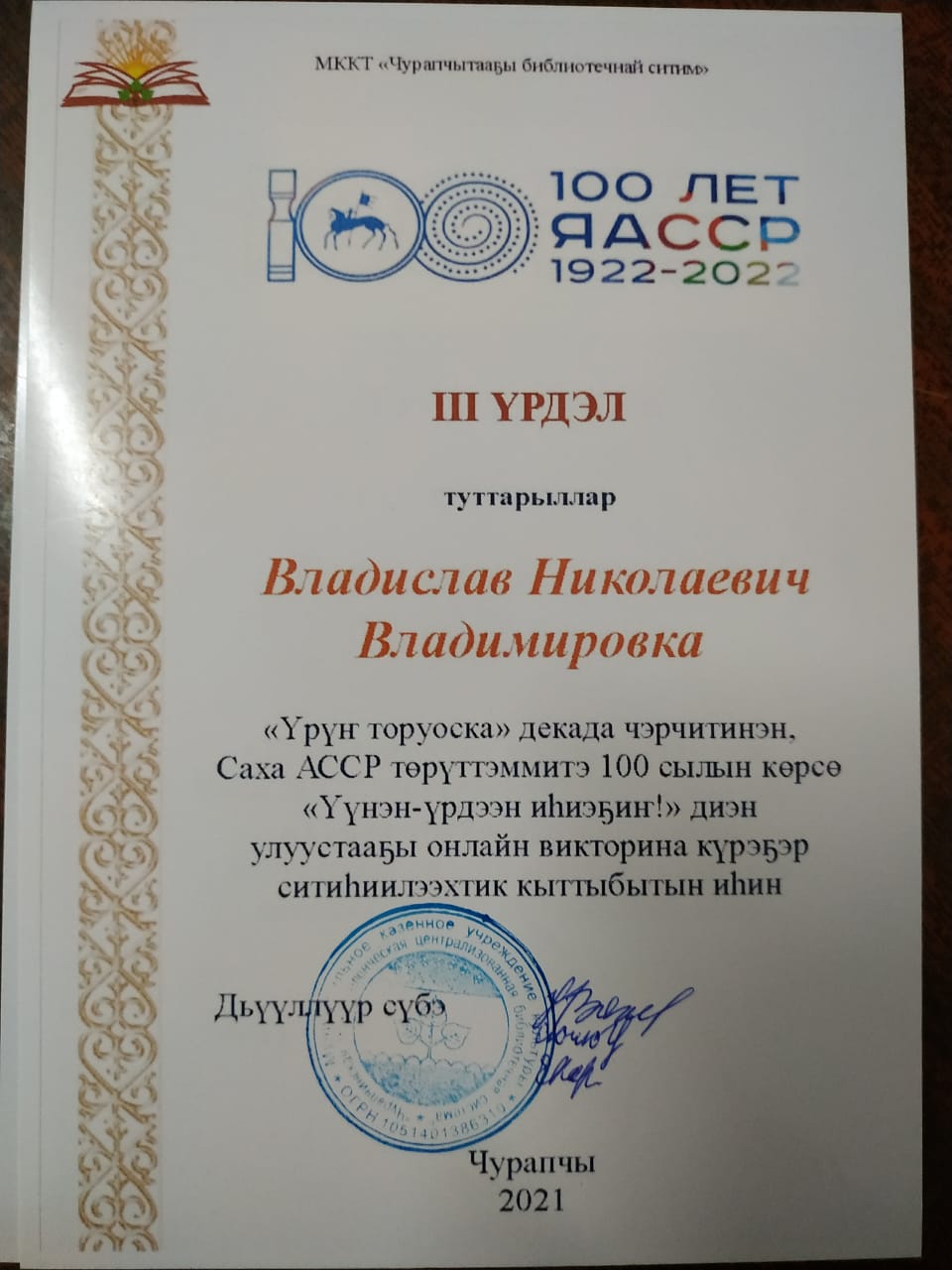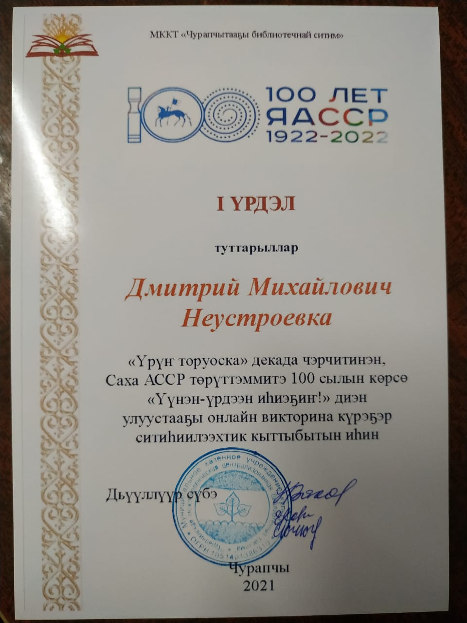 1 үрдэл — Дмитрий Михайлович Неустроев (Чурапчы нэһилиэгэ);