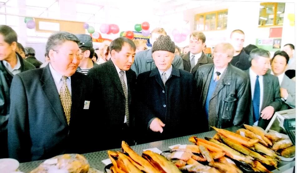 Министр сельского хозяйства Е.А. Борисов, генеральный директор ФАПК «Якутия» П.С. Ефремов, Президент РС (Я) М.Е. Николаев, Первый заместитель Председателя Правительства РС (Я) И.Н. Долинин. Продовольственная ярмарка, «Крестьянский рынок». 1999 г.