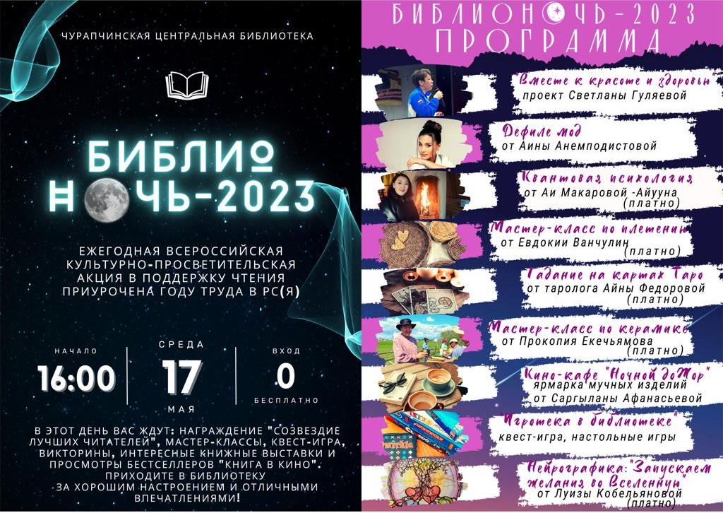 17 мая приглашаем всех на ежегодную культурно-просветительскую акцию «Библионочь — 2023 «Читаем вместе».БИБЛИОНОЧЬ--ЕЖЕГОДНАЯ ВСЕРОССИЙСКАЯ КУЛЬТУРНО-ПРОСВЕТИТЕЛЬСКАЯ АКЦИЯ В ПОДДЕРЖКУ ЧТЕНИЯ ПРИУРОЧЕНА ГОДУ ТРУДА В РС(Я).
