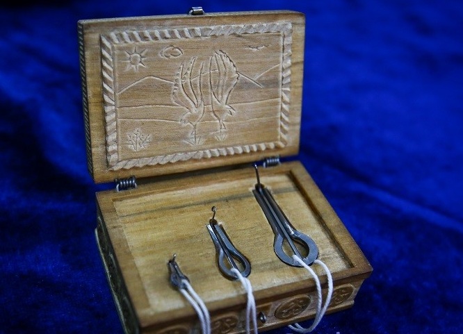 Онтон бу сахалыы хоппо хаалаах, үс кэчиригэспит кыракый хомустары Чурапчы олохтооҕо, Ырыа Ылдьаа уола Никифор Неустроев оҥорон түмэлгэ бэлэхтээбит. Икки арыый обургу хомустарынан тыас таһаарыахха сөп буоллаҕына, кырата көннөрү экспонат эрэ быһыытынан турар эбит.