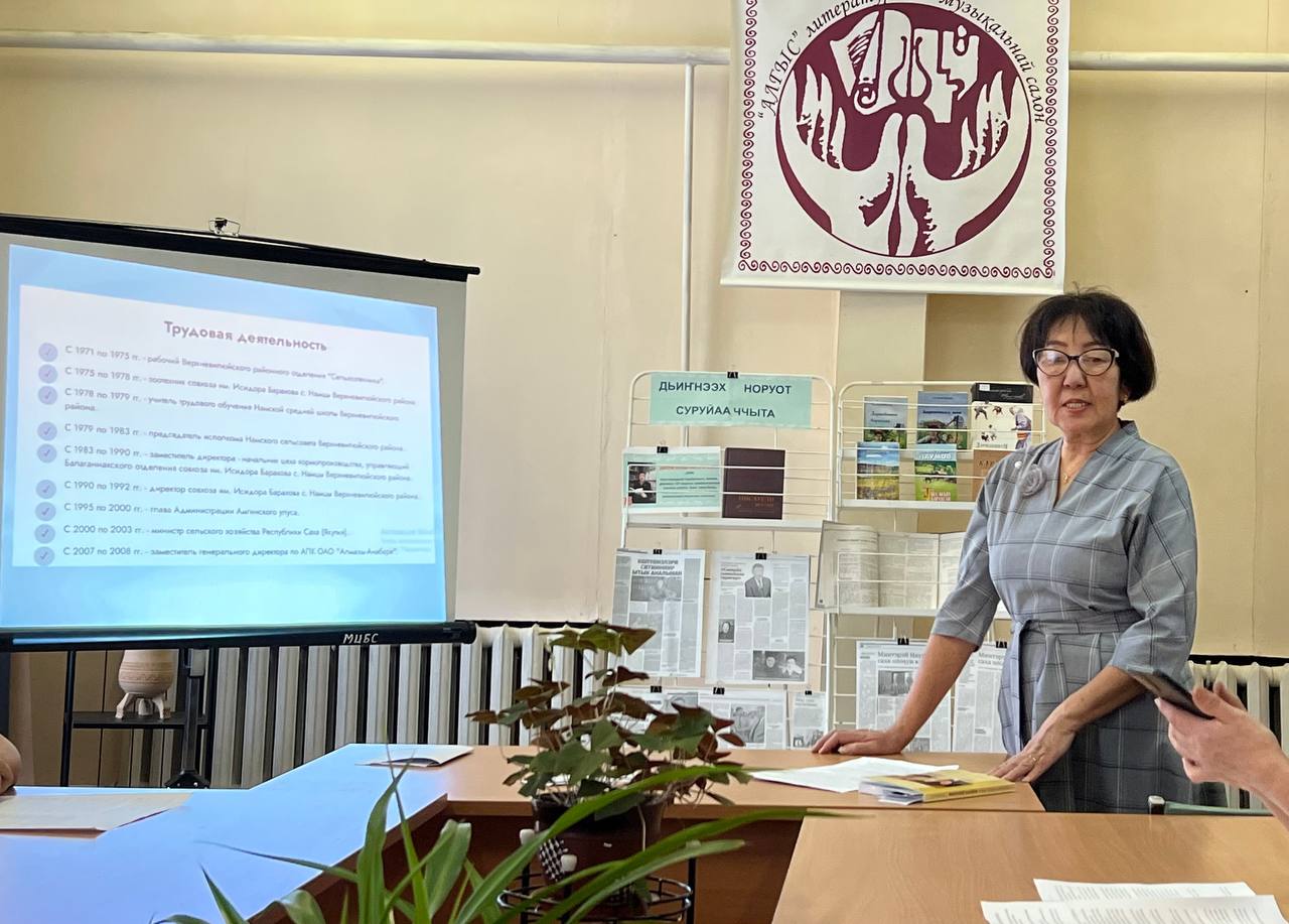 Киин бибилэтиэкэ исписэлииһэ Флегонтова Саргылаана Кэнчэриевна Миитэрэй Наумов айымньыларын туһунан кэпсээтэ. Ордук сөбүлээн аахпыт дьиэ кыылларын туһунан көрдөөх кэпсээннэрин кэпсээтэ.