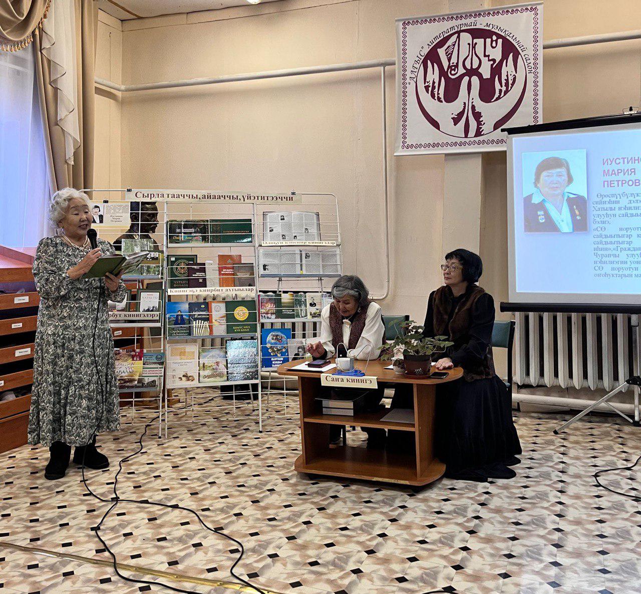 Сэтинньи 23 күнүгэр Чурапчы киин бибилэтиэкэтигэр ССРС уонна Саха Өрөспүүбүлүкэтин култууратын туйгуна, Өрөспүүбүлүкэ култууратын үлэһиттэрин алтыс сийиэһин дэлэгээтэ, уон биирис пятилетка кыайыылааҕа, Хатылы нэһилиэгин, Чурапчы улууһун бочуоттаах олохтооҕо, норуотун маастара, Саха Өрөспүүбүлүкэтин норуотун уус-уран уонна илиинэн уһаныы оҥоһуктарын маастара, Чурапчы улууһун култууратын бэтэрээнэ, «Чурапчы улууһун сайдыытыгар кылаатын иһин» III истиэпэннээх, «Саха Өрөспүүбүлүкэтин норуоттарын култуурунай айымньытын сайдыытыгар кылаатын иһин», «Хатылы нэһилиэгин сайдыытыгар кылаатын иһин», «Гражданскай килбиэн бэлиэлэр» хаһаайына, Хатылы нэһилиэгин бибилэтиэкэтин сэбиэдиссэйинэн 40-тэн тахса сыл үлэлээбит, биһиги бэтэрээммит Мария Петровна Иустинова суруйбут «Олоҕум ыллыга» кинигэтин сүрэхтэниитэ буолан ааста.