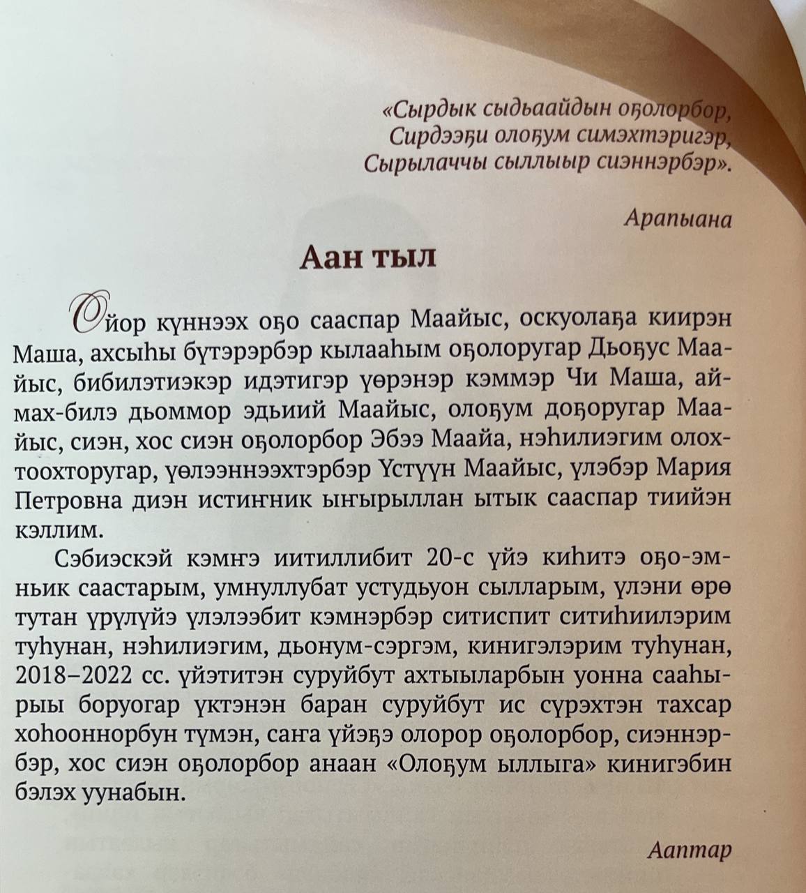 Тэрээһин бүтүүтэ Мария Петровна бэйэтин санаатын, кинигэ хайдах суруллубутн туһунан ахтан-санаан кэпсээтэ, кэлбит ыалдьыттарга махтанна.