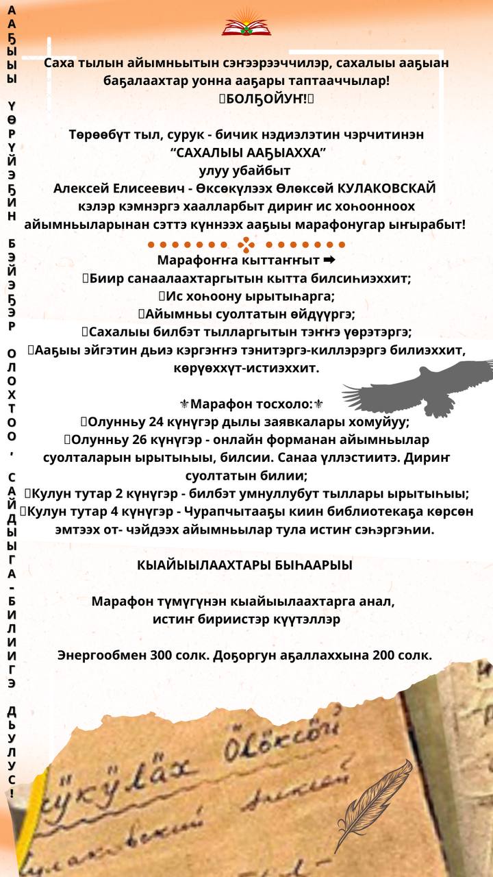 Саха тылын айымньытын сэҥээрээччилэр, сахалыы ааҕыан баҕалаахтар уонна ааҕары таптааччылар!БОЛҔОЙУҤ!Төрөөбүт тыл, сурук — бичик нэдиэлэтин чэрчитинэн “САХАЛЫЫ ААҔЫАХХА” улуу убайбыт Алексей Елисеевич — Өксөкүлээх Өлөксөй КУЛАКОВСКАЙ кэлэр кэмнэргэ хаалларбыт дириҥ ис хоһоонноох айымньыларынан сэттэ күннээх ааҕыы марафонугар ыҥырабыт!