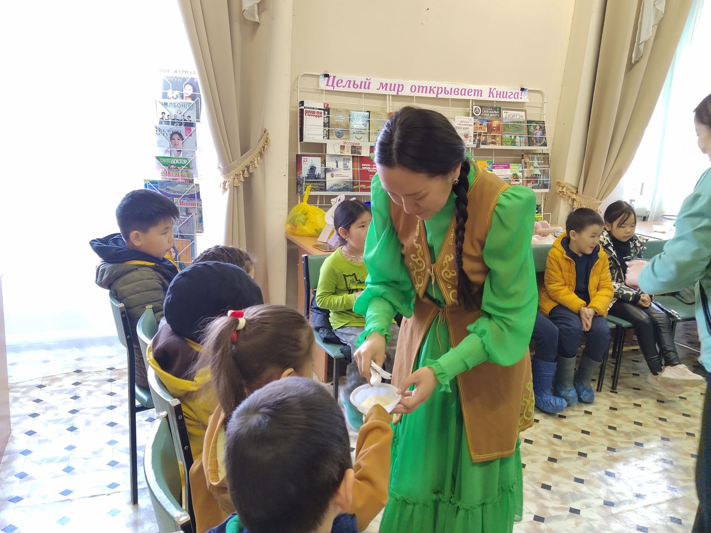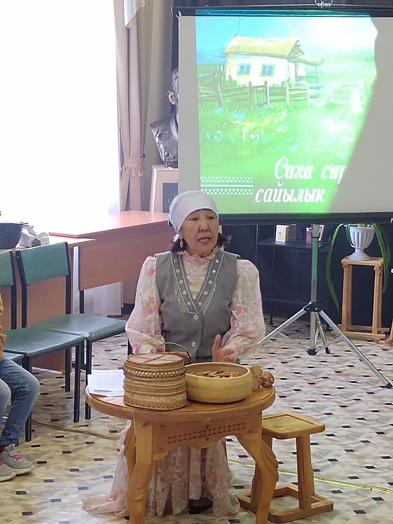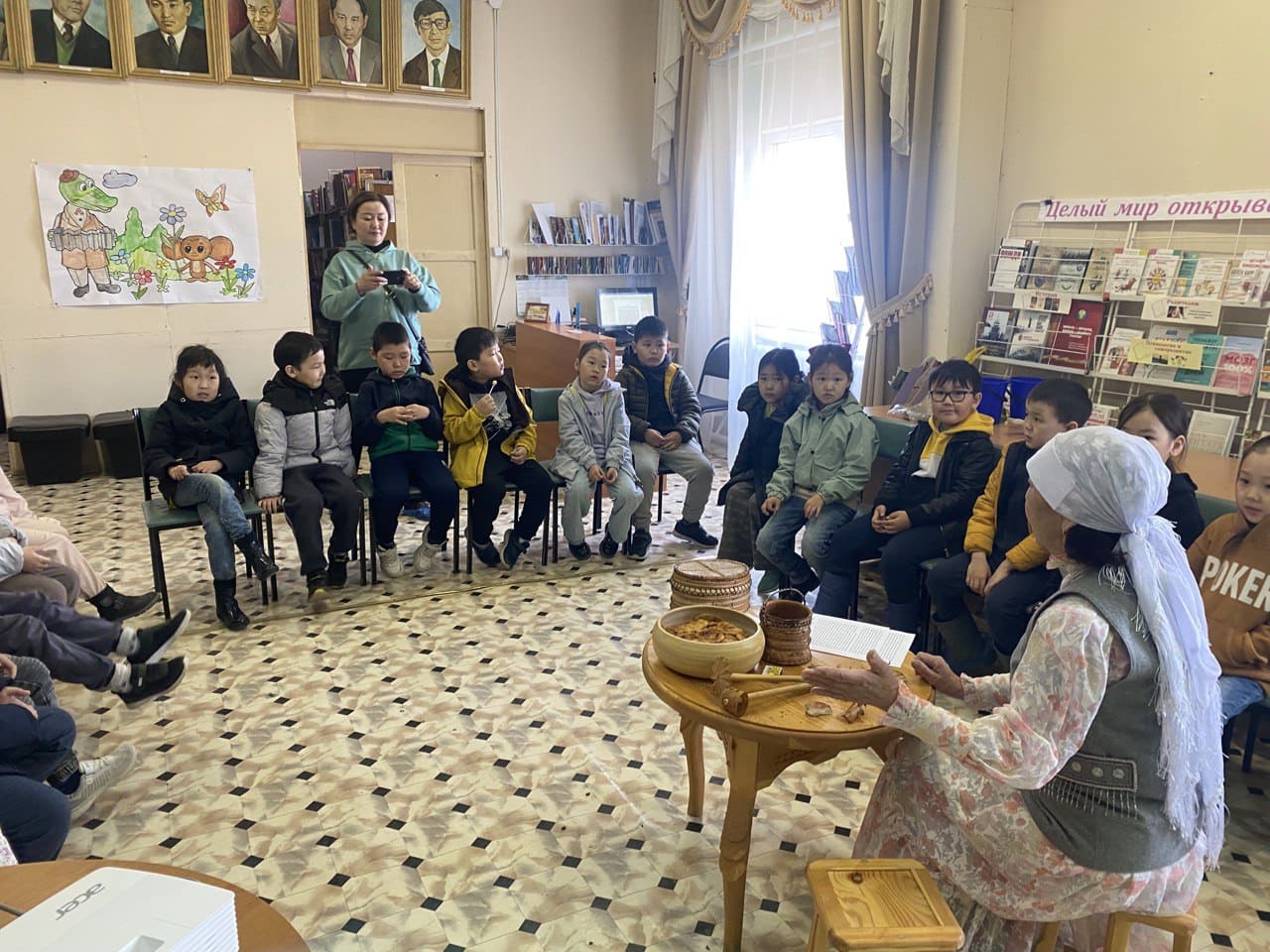 Салҕыы библиотекарь Захарова Матрена Николаевна оҕолорго сайылыкка көһүү туһунан, кини суолтатын, хайдах сайылыкка көһөллөрүн, туох сиэри-туому тутуһалларын, сайылык олоҕун, үлэтин саас сааһынан быһааран кэпсээбитин оҕолор сурдээҕин интириэһиргээн иһиттиллэр. Кырачаан ыалдьыттар бу күн сахалар саамай суолталыыр күндү астарын арыылаах алаадьыны, миньигэс саламааты амсайдылар.