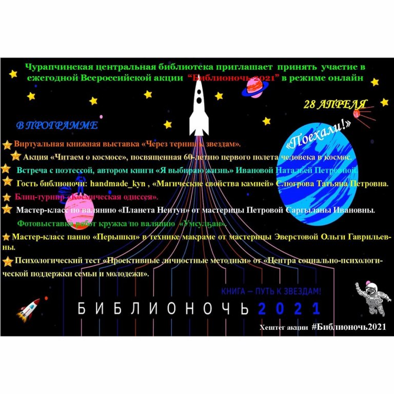 Место проведения: инстаграм @churbiblioteka, YouTube https://youtu.be/nSa6pPbmWvUАкция *«Читаем о космосе»,* посвященная 60-летию первого полета человека в космос.